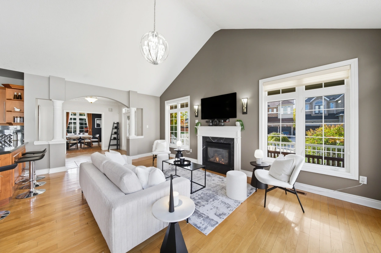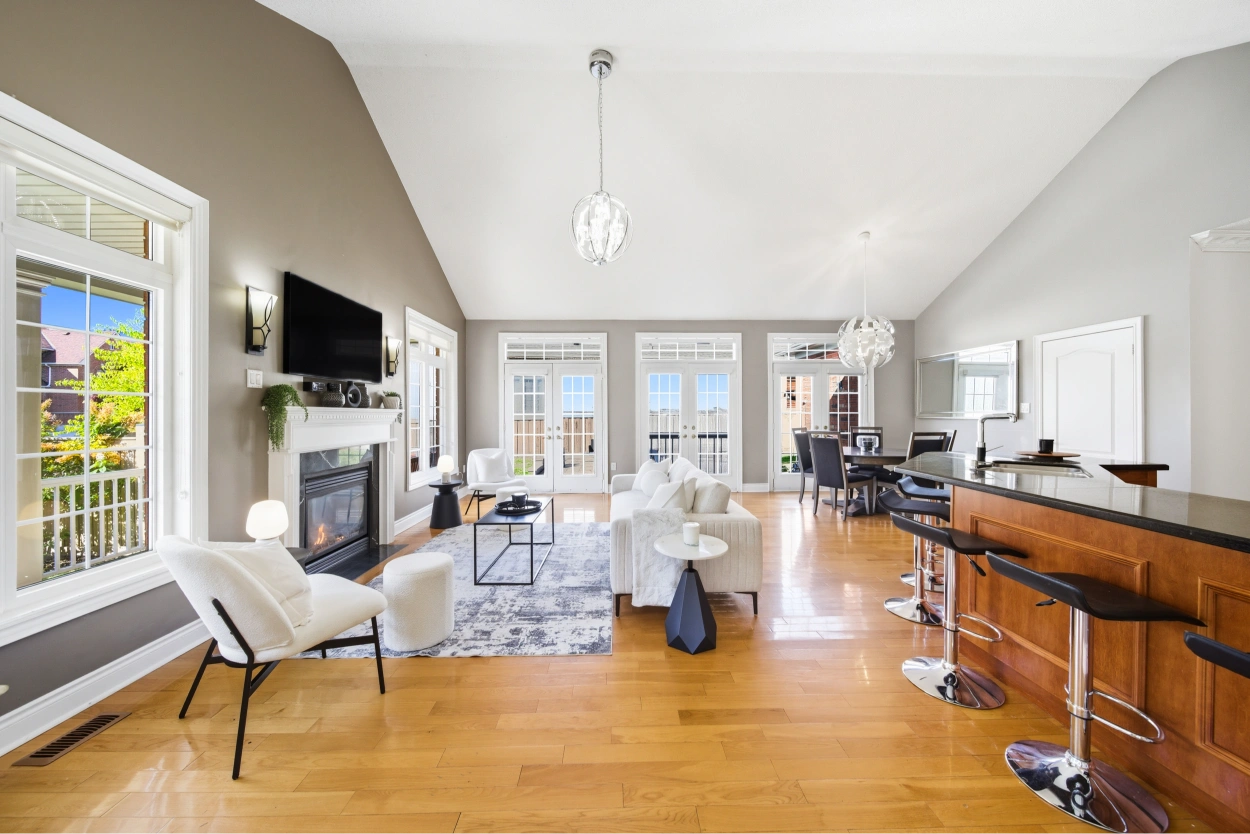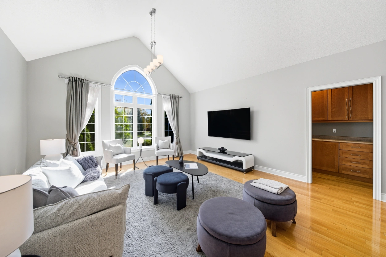 Just off the main living area, you’ll find a massive family room with soaring vaulted ceilings and wall-to-wall windows that flood the space with natural light. An adjoining servery adds convenience for gatherings and special occasions.