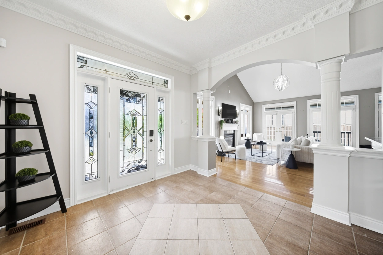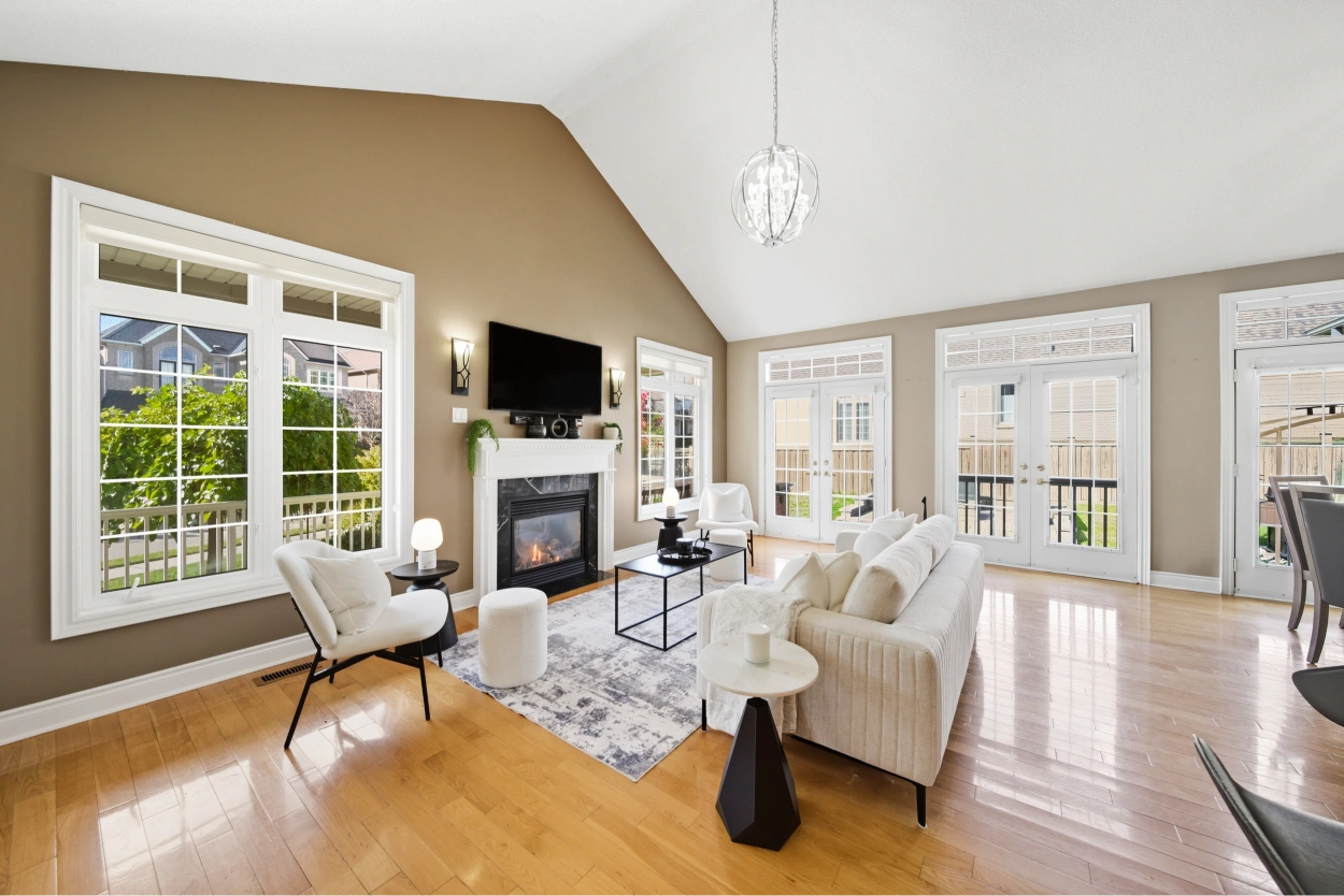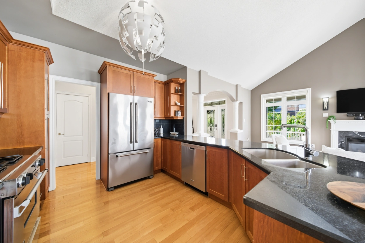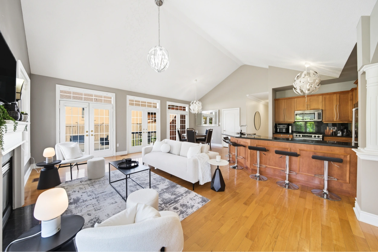 Just off the main living area, you’ll find a massive family room with soaring vaulted ceilings and wall-to-wall windows that flood the space with natural light. An adjoining servery adds convenience for gatherings and special occasions.