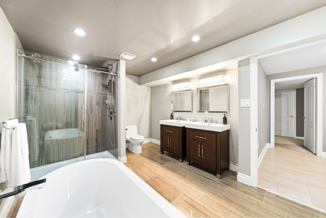 The primary suite is your private retreat, complete with a luxurious 5-piece ensuite featuring a soaker tub and glass shower. Two bedrooms share a stylish Jack-and-Jill bath with double sinks, while the fourth bedroom has its own private 3-piece bathroom.