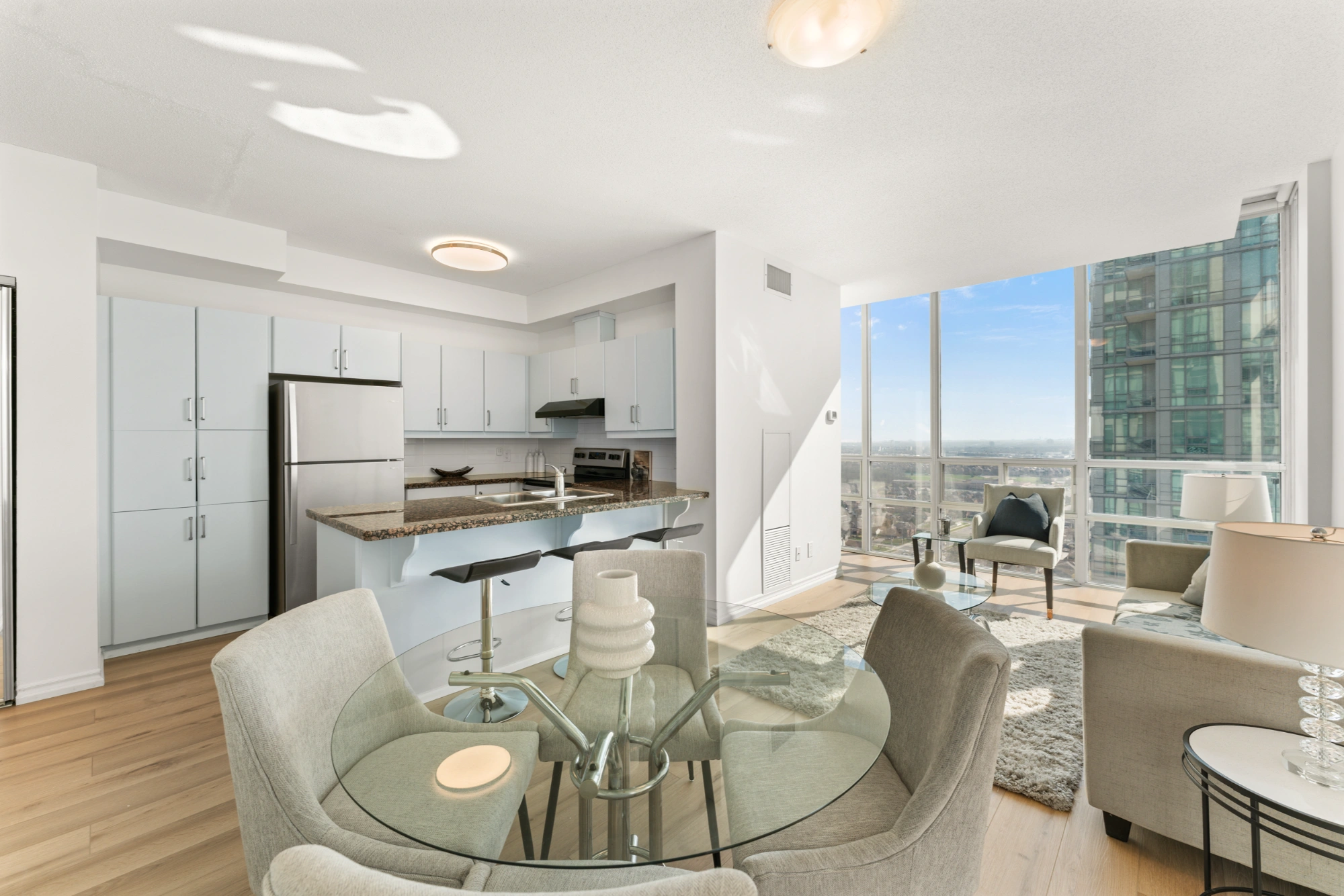 This 900 square foot, 2+1 bedroom, 2 bathroom corner suite is exceptionally bright and airy and has 9 foot ceilings, new roller blinds and flooring throughout, and sweeping south west views of the city and lake.