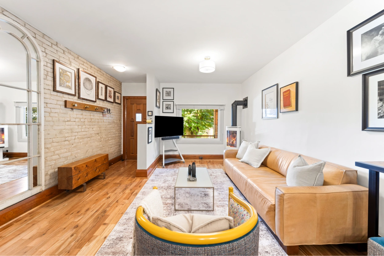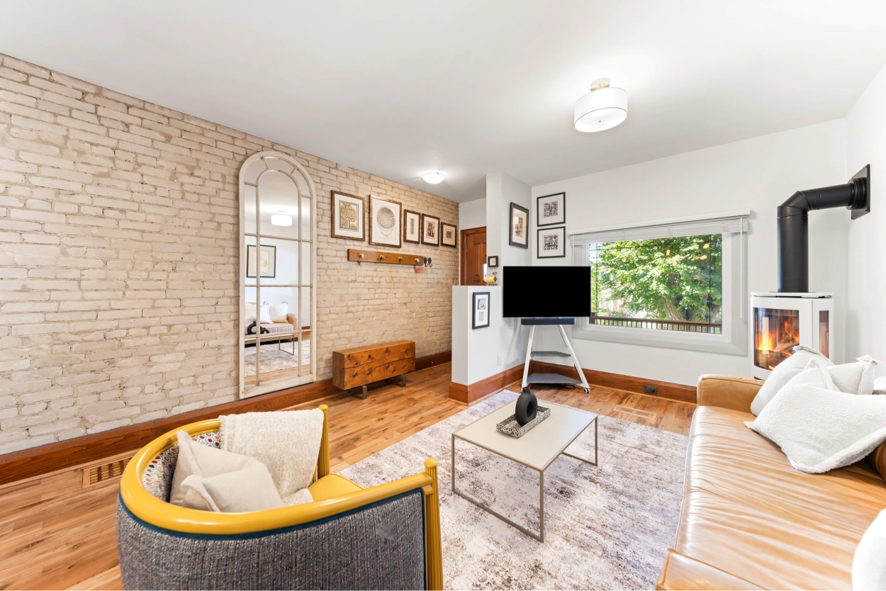 Step onto the elevated, private front porch and enter a warmly welcoming home that’s been thoughtfully updated. The open plan main floor features gorgeous hardwood floors, exposed brick, and a bright, renovated kitchen complete with quartz countertops, a glass tile backsplash, and a breakfast bar—perfect for everyday living or entertaining guests.
