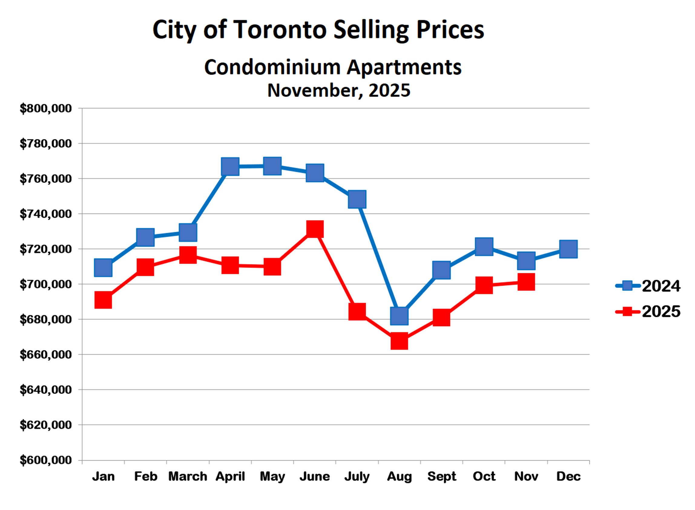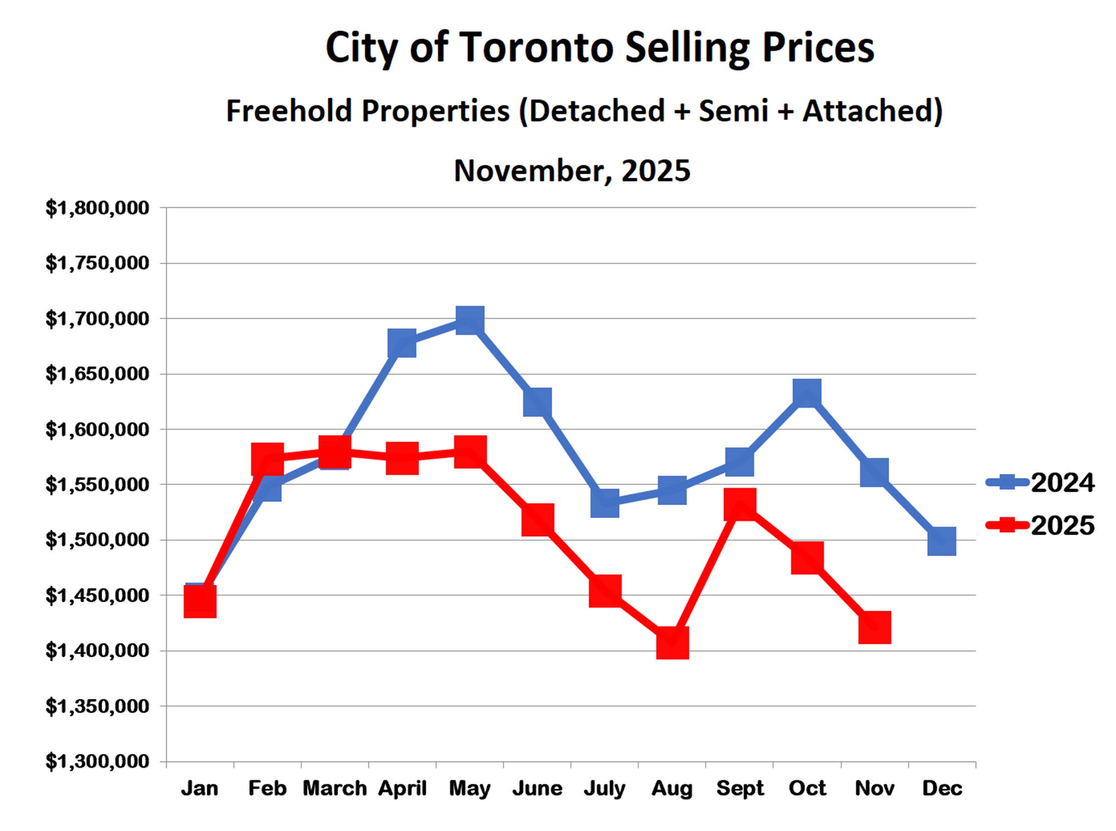 Toronto prices for both houses (-8%) and condos (-10%) have declined significantly since the ‘bubble peak’ in 2022. Most industry experts are forecasting that this decline will continue in 2026, though of course predicting the market has become somewhat of a mug’s game since Covid. Even if this is forecast is correct, a seasonal pattern including higher prices in the spring and fall against a backdrop of overall lower prices is certainly possible. We’ll see if the hoped-for ‘spring surge’ materializes.
