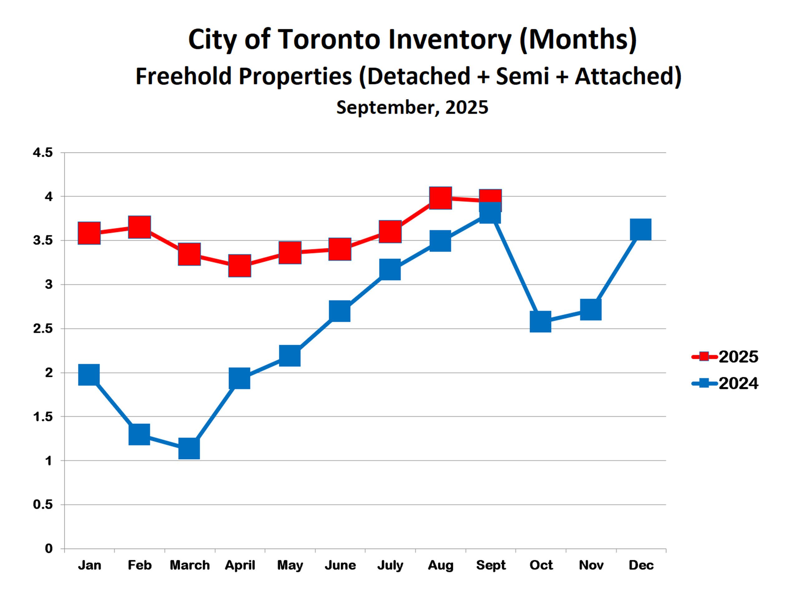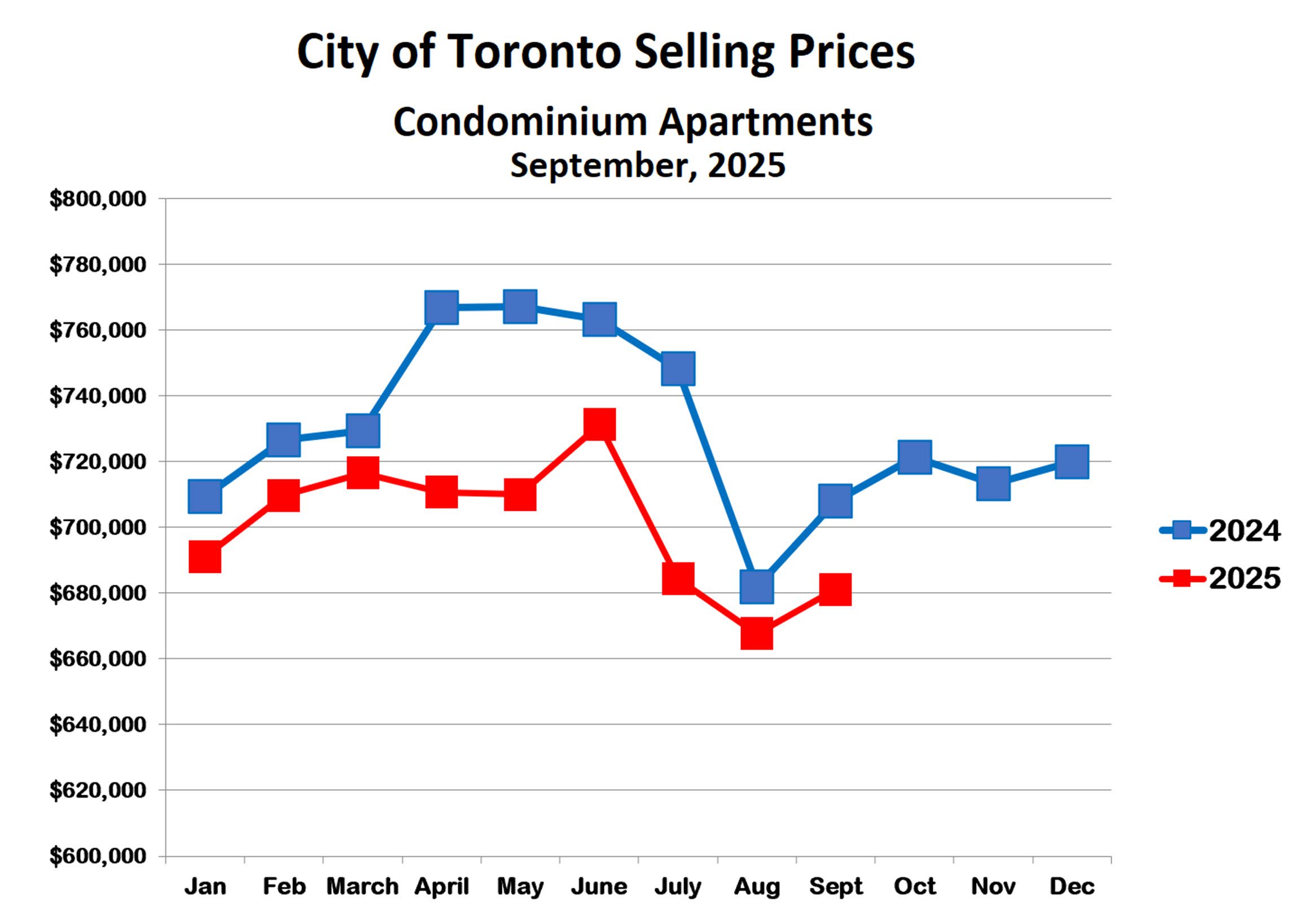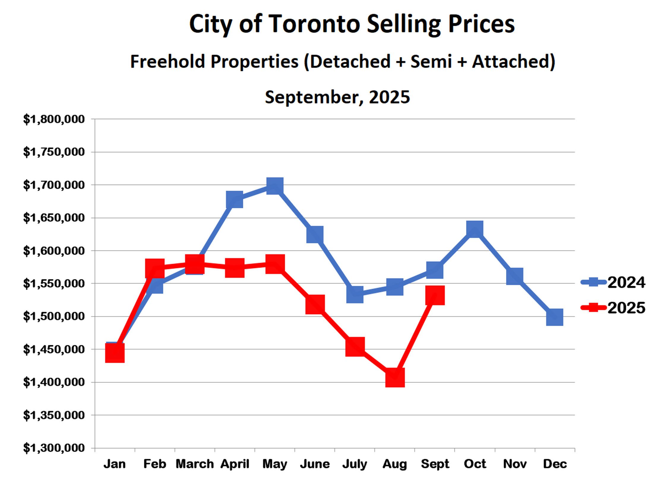 Toronto house prices fell sharply from May through August, but rebounded sharply in September, as per the normal seasonal trend. The average price for houses is now 2.5% below last September, closer than it’s been since the Tariff Troubles began in the spring. If past is prologue, prices should continue to rise in October and then fade as we get closer to the holiday season. Another interest rate cut in October by the Bank of Canada might even extend the fall market further.